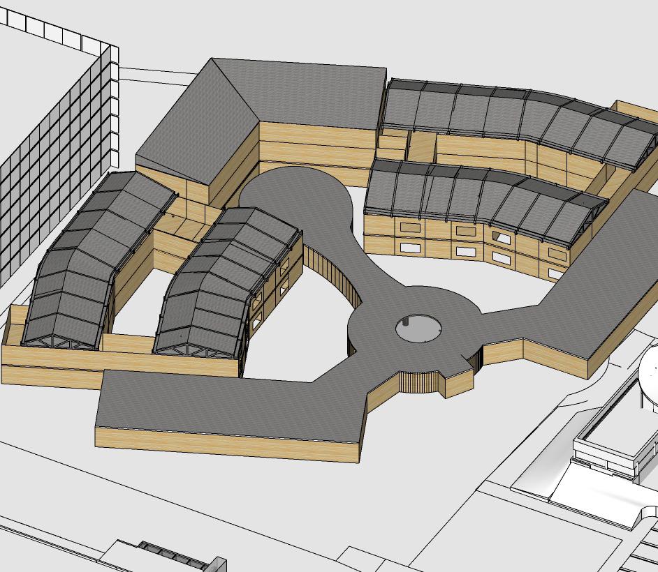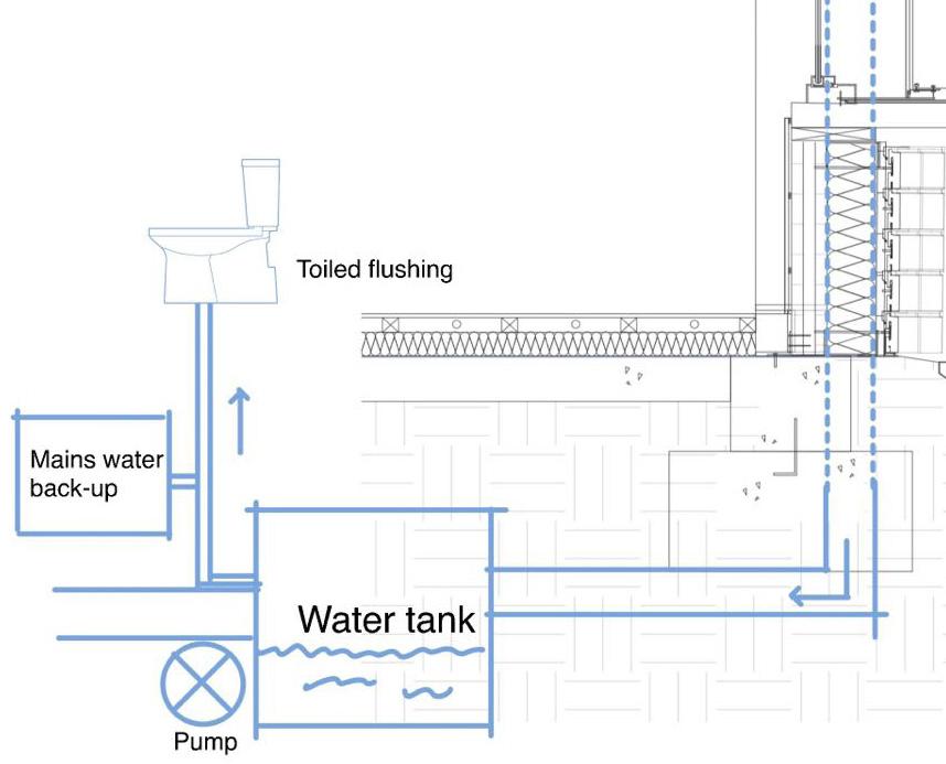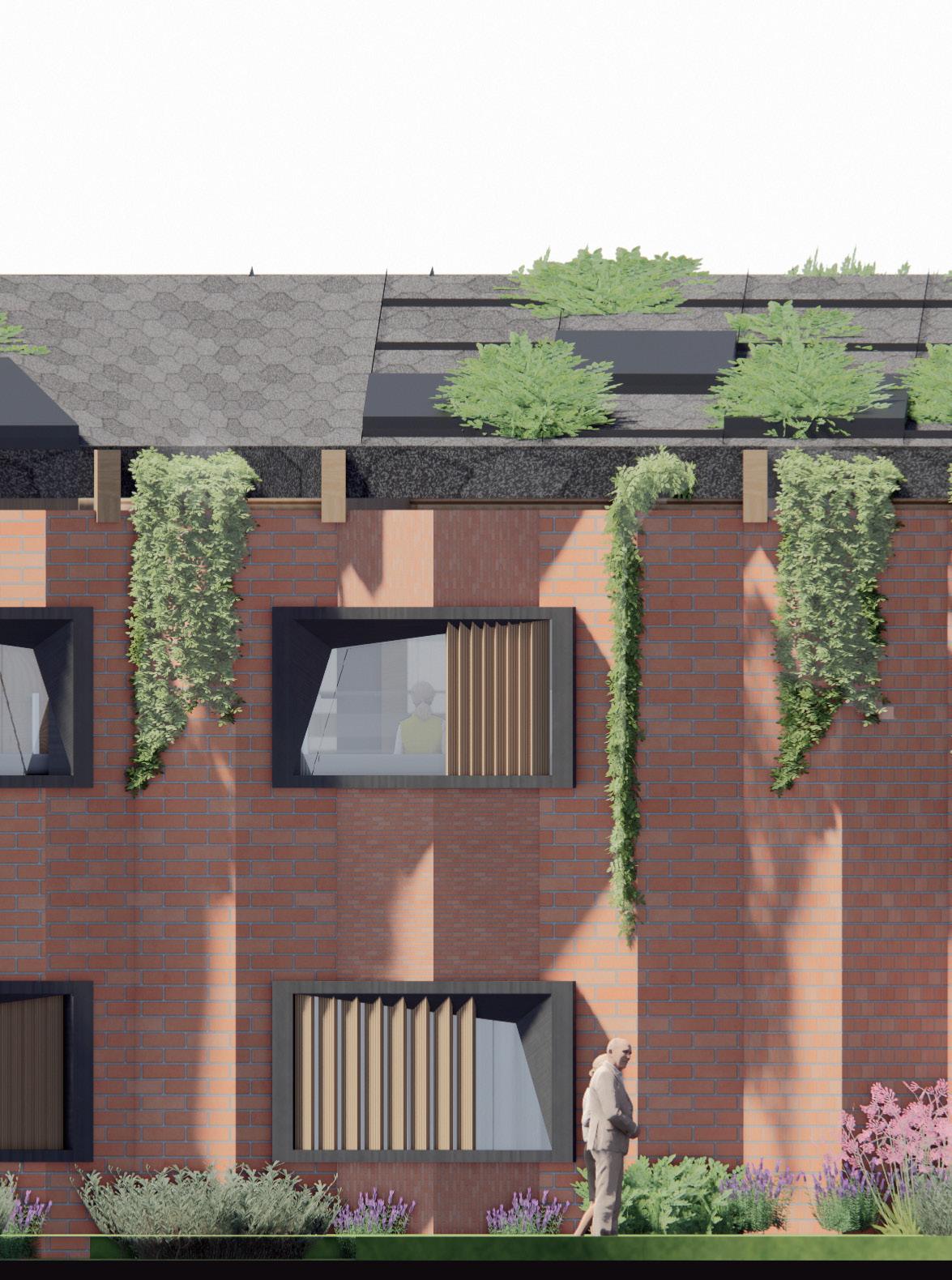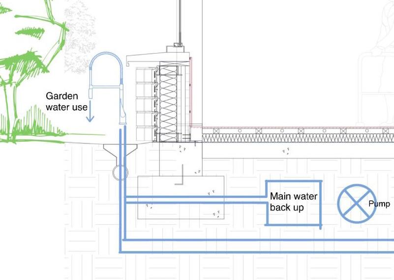 An additional sustainable thought in my design is the rain harvesting system. The vegetation on the pitched roof would slow the rainwater down. The water that split out would run down through the gutter and be stored in an underfloor water tank. This water can provide partially toilet flushing water as well as garden use. However, the main water backup supply could support the daily use when it is needed.