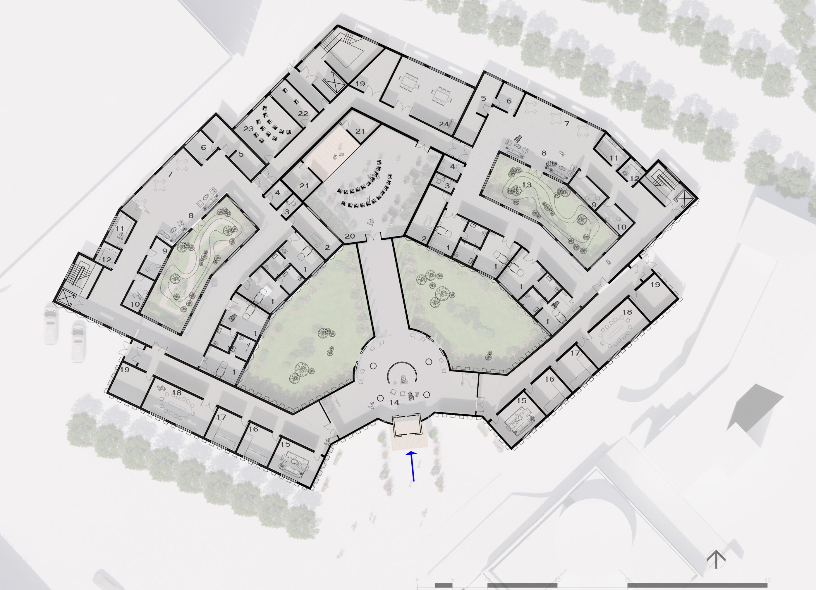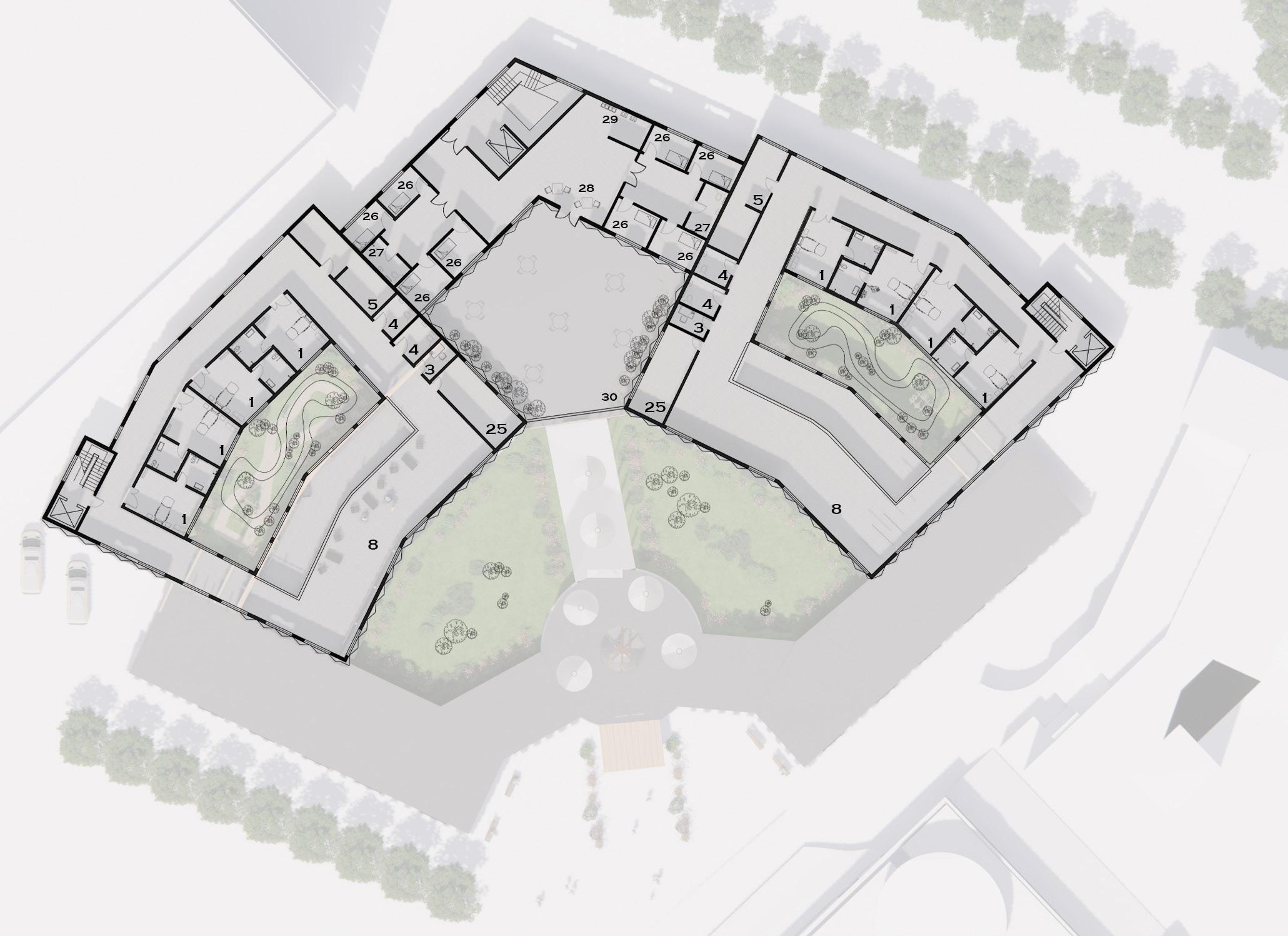 One of the critical natural elements to shape the building form is the sun path. In a dementia care home, interior light uniformity plays an important role to support patients’ daily activities. To respond to this issue, the patient’s pods (wards) are located in the south part of the building to ensure the living space has natural daylight at all seasons.
