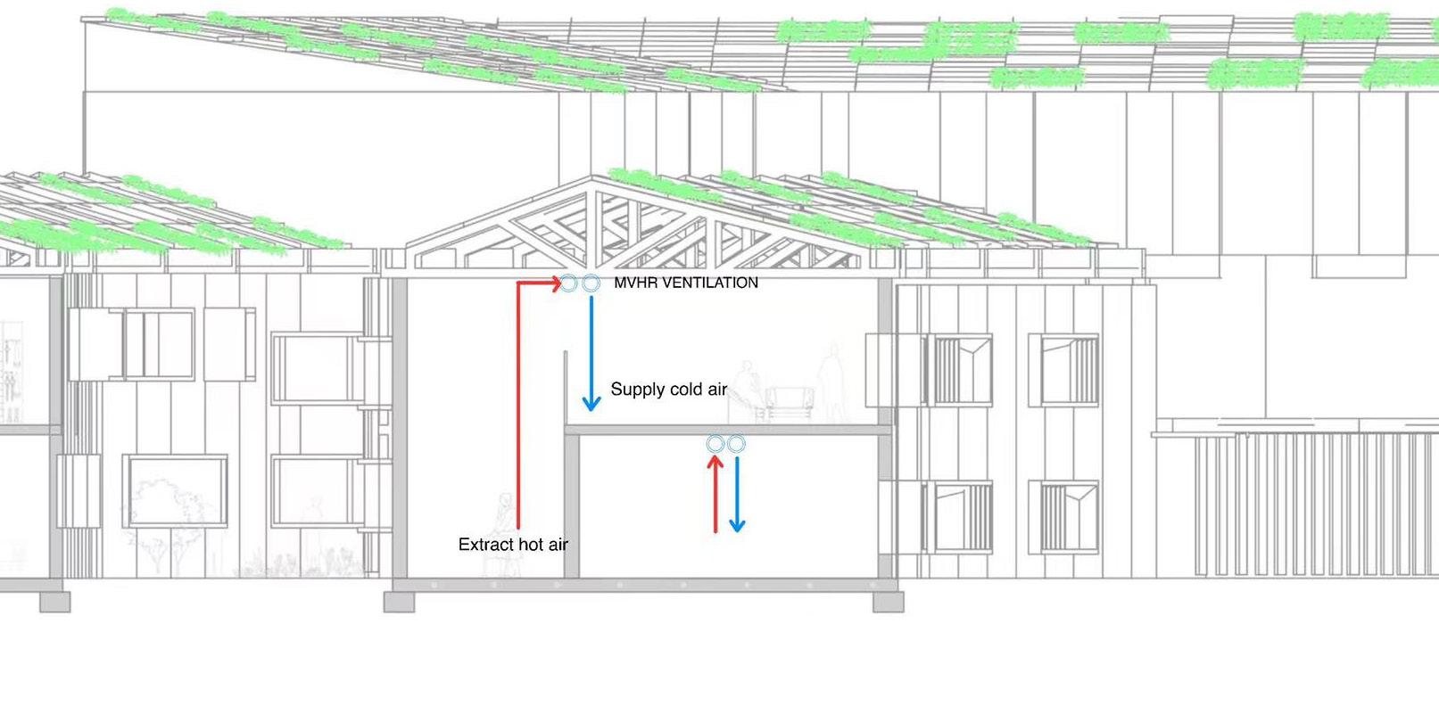 The primary method to ventilate this building is natural ventilation. There are windows on both sides of the building, so the air can form good convection. In addition, MVHR ventilation would provide interior space with fresh and cool air as well as extract hot air.