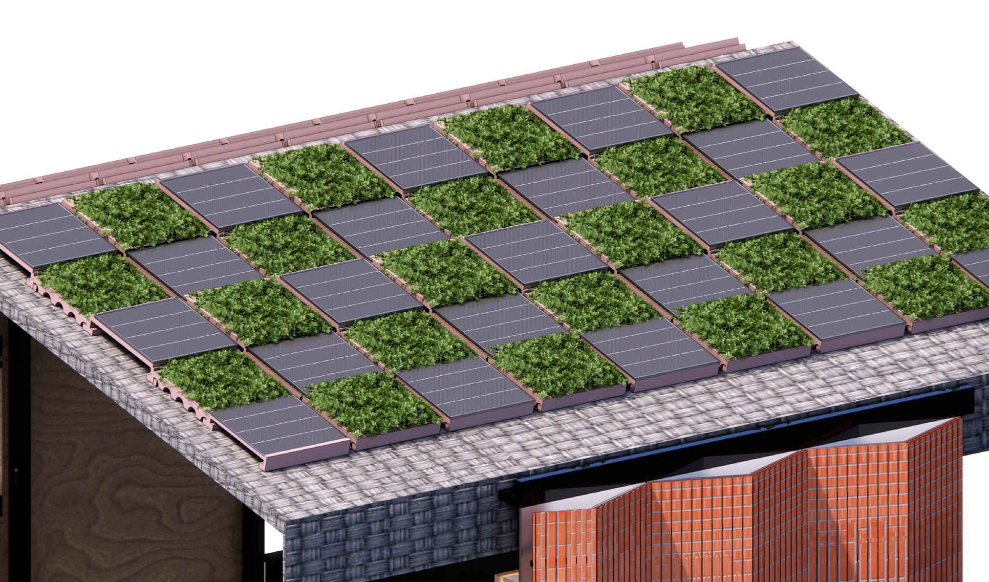 The roof is designed into a grid frame, which allows the PV and vegetation been placing together, the green roof reduces the temperature on the roof. This would cool the roof. The result would be to improve the efficiency of the PV. The higher efficiency of solar panels can reduce total energy costs.