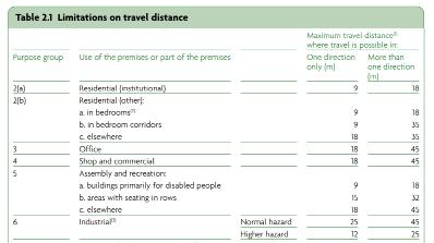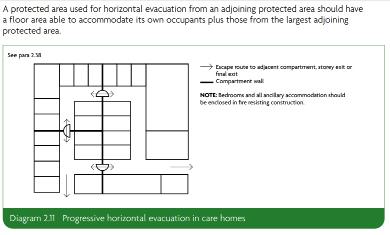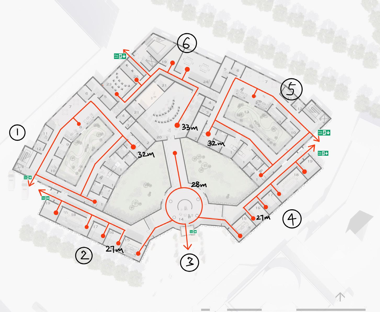 The regulation instructs that the care home should have fire escape routes shorter than 35 meters and shorter than 18 meters from bedrooms.