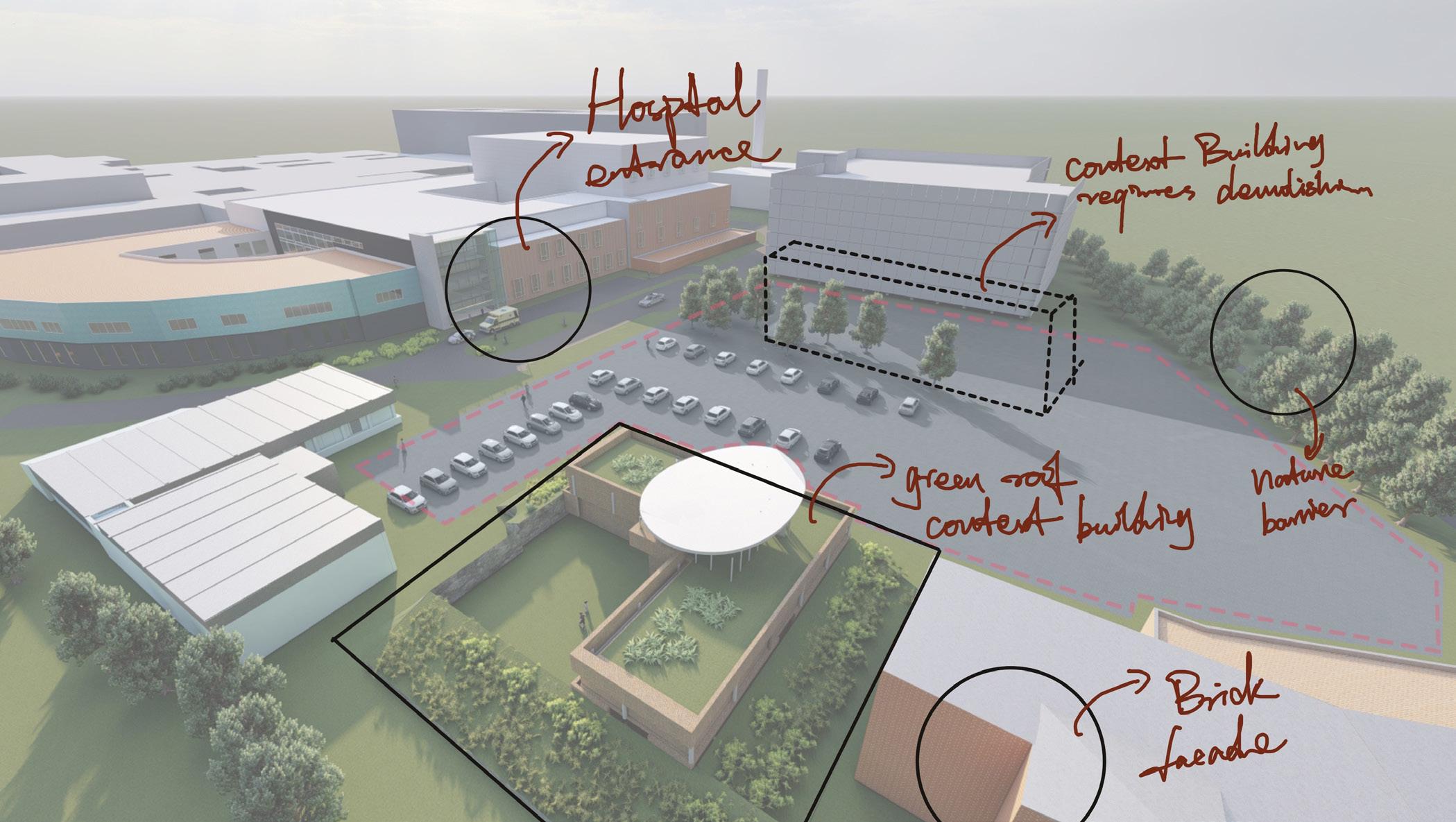 Our project site is located at the Freeman hospital in Newcastle, next to Maggie’s centre. The area of the site is nearly 1200m2, and surrounded by medical buildings mainly. This is a new build project which would involve the demolition of one existing building on the site. The main challenge of this site is the spatial arrangement; how would this large-scale therapeutic building cooperate with the existing context. To answer this challenge, I analysed the existing urban fabric as well as the building material around the site, which helped my design to fit into the context and adjust my design decision.