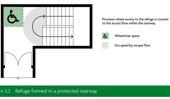 CLT’s fire resistance is provided through‘charring’. As the face of the timber panel is exposed to a fire that ramps up to a temperature in excess of 400 degrees C, the surface of the timber ignites and burns at a steady rate. As the timber burns it loses its strength and becomes a black layer of ‘char’. The char becomes an insulating layer preventing an excessive rise in temperature within the unburnt core of the panel. It is this unaffected core which continues to function for the period of the fire resistance (CLT hand book). Therefore, all the CLT structure interior surfaces would be treated at as a 30min fire resistance layer to ensure the structure frame would not lose the loadbearing function when it has fire, allowing the user evacuate the building safely. According to the regulation, the fire staircase should have space for wheelchair refuge points. The stair in the middle of the building (left) has a larger space than the requirement. However, the stairs located at the wards (bottom left) have not met the requirement of evacuation. I have improved the dimension of the stairs to meet the requirement.