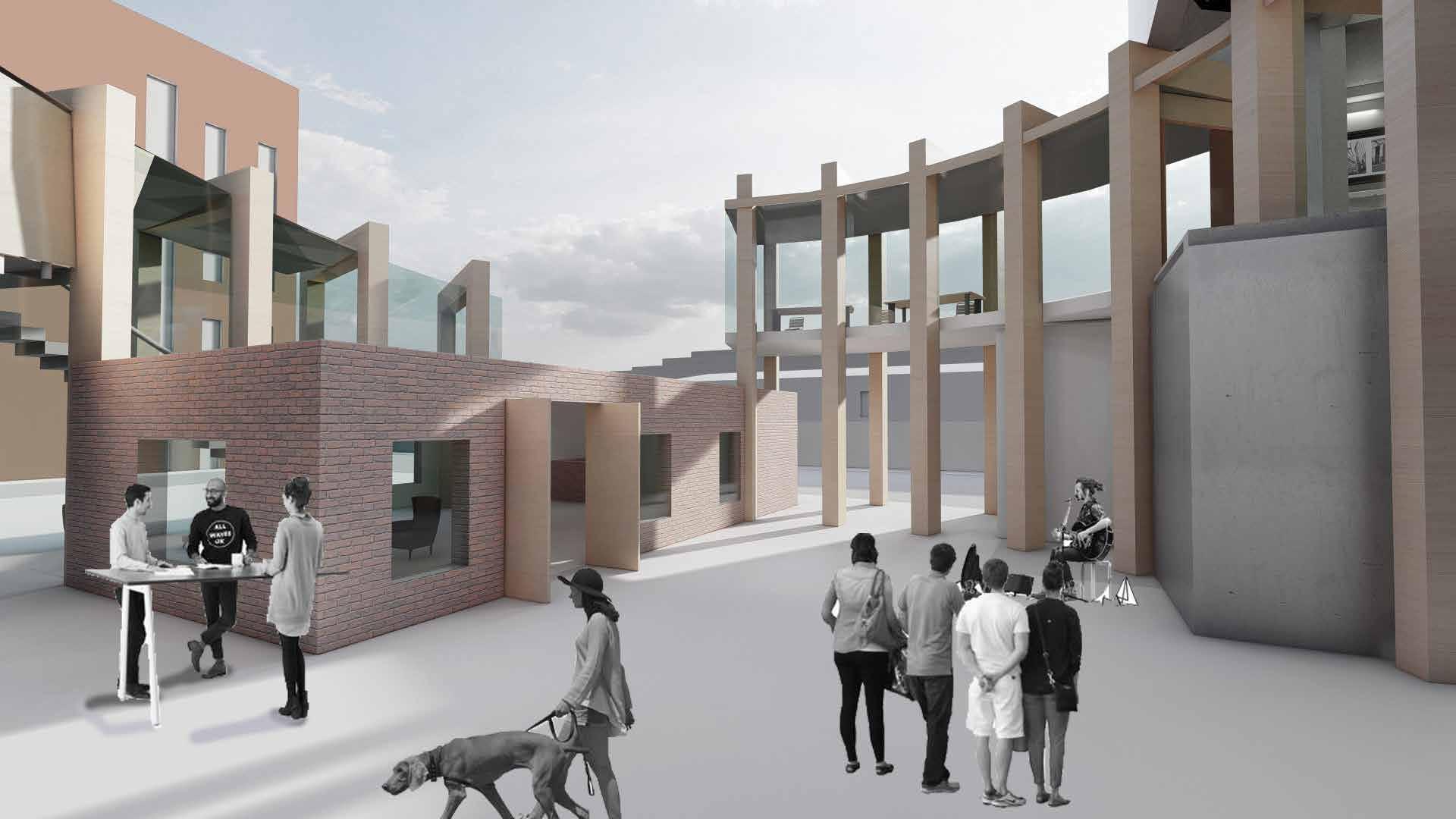 At the end of the corrido, there is a stair case that leads people back to the ground level. People could access the court yard space by walking through the cafe shop, where might hold some small scale event or some street food during the weekend.