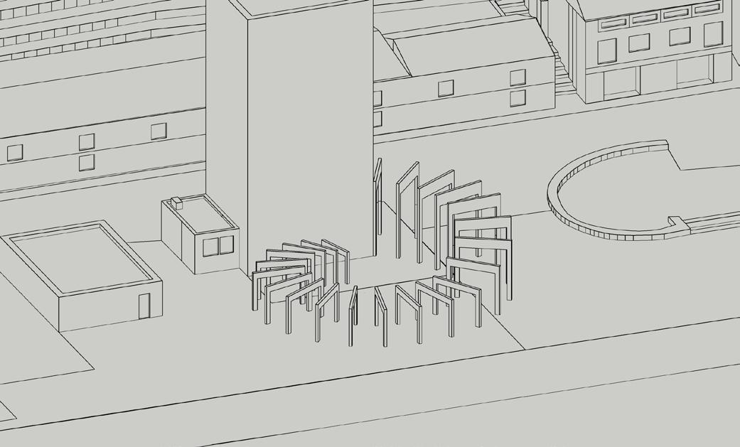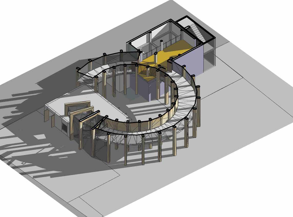 The final version developed the idea that connect two building blocks. The new structure would intersect the ice tower’s first floor, at the end of the circle, a stair case would lead people back to the ground floor. The most of the ground floor would be lite up, allowing pedestrians to walk through the new structure.
