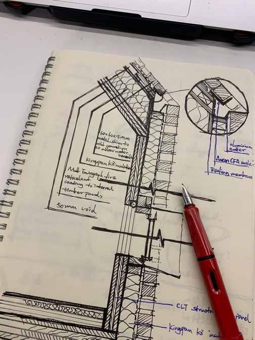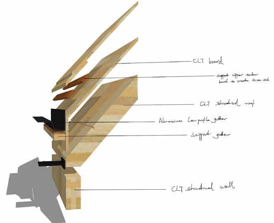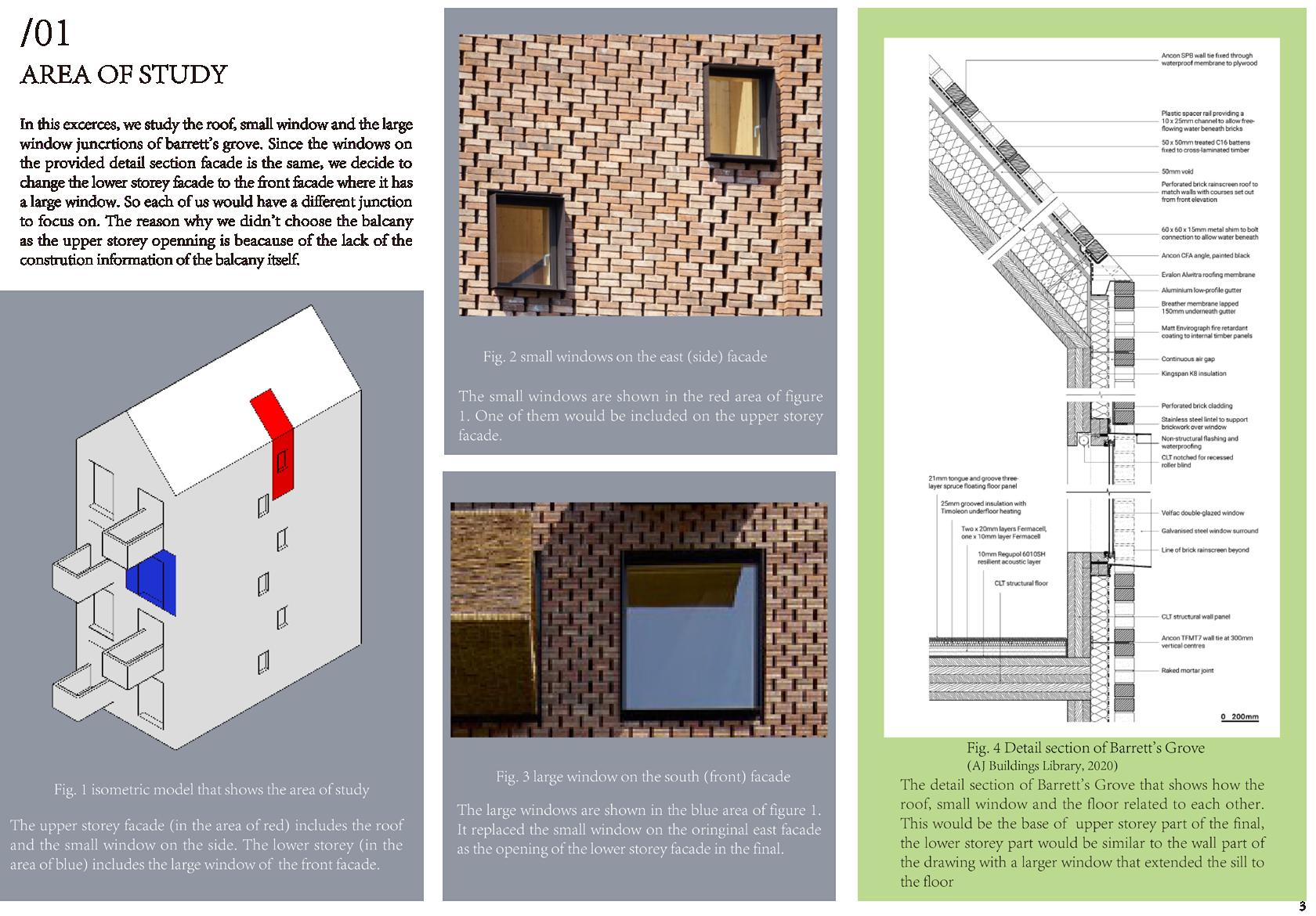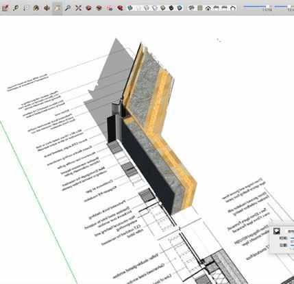 To sum up the junction A, in personal perspective, the CLT structural roof and structural wall is the most important element which is the first component assembled in construction process. It is supporting the most of weight and connect the secondary load-bearing structure such as wall tie. To modeling digitally would not worry about gravity, but it would be more challenging build it in correct order. In addition, the brick facade on the roof is most trick part of modeling. There are two critical elements to prevent the brick slid down. First, the designer place two Ancon SPB wall tie between each two brick, which is fixed through waterproof membrane to the plywood board. The other one is an Ancon CFA steel angle which fixed to the structural CLT board at the edge of the roof. It would stop the brick slid down.