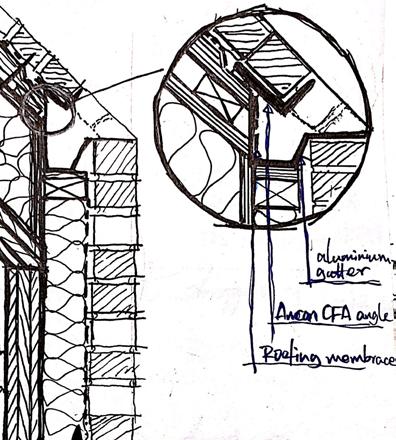 The junction A is the connection between structural wall and roof. The process of making the accurate model is approaching the information provided by the architect first (figure 2). Then drew the sketch to increase the layout of the structural components (figure 3, 4). Finally use the dimension that measure from technical section drawing to begin the digital modeling (figure 5,6).