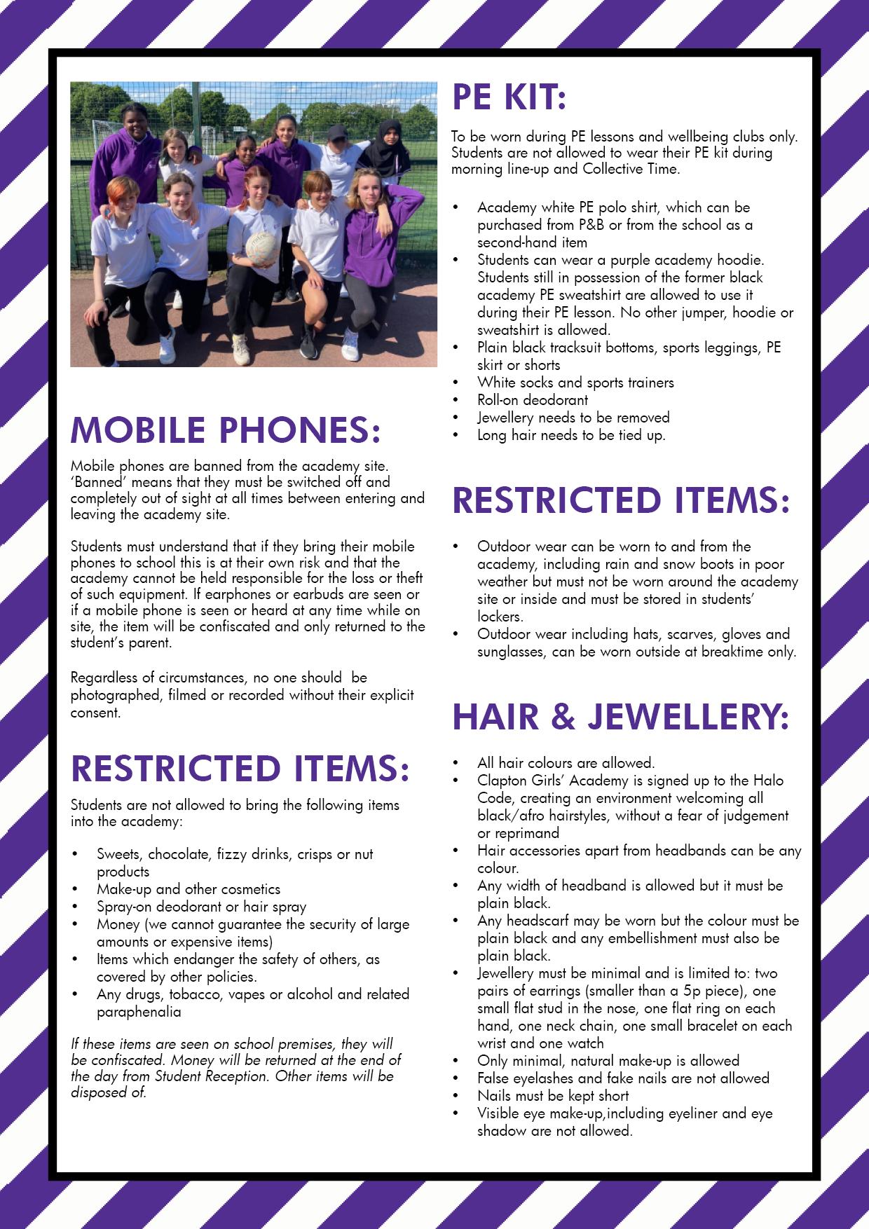 Clapton Girls’ Academy is an inclusive academy where we focus on the progress and wellbeing of every student and where all members of our community are valued equally. We work together to ensure that students are healthy, stay safe, enjoy and achieve, make positive contributions and achieve economic well being.