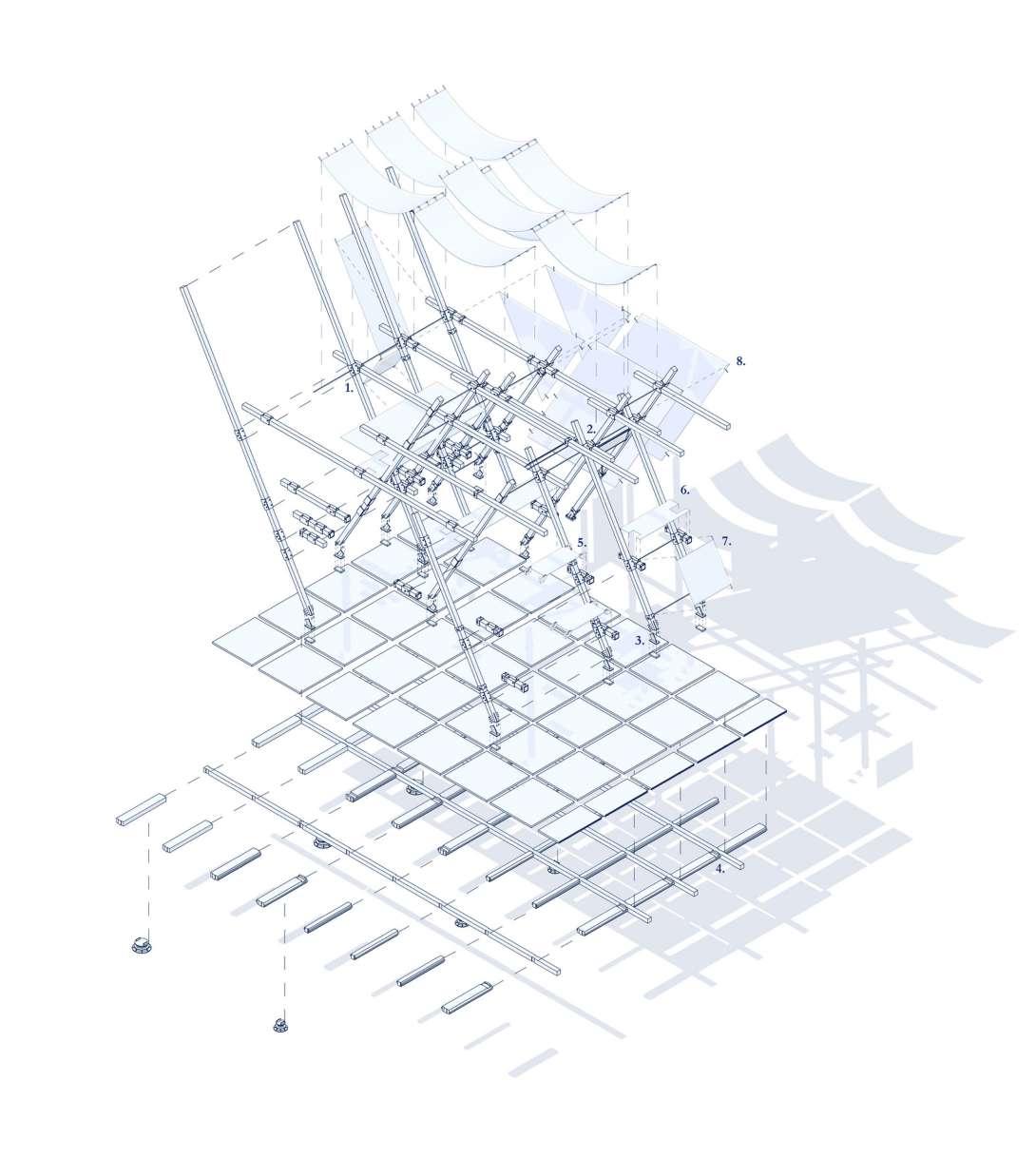 The project’s technical innovation lies in its connection system, inspired by scaffolding connectors. This design choice minimizes intervention on the wooden elements, maximizing material reusability and structural integrity. The effectiveness of these connections was validated through a 1:2 scale mockup (refer to section 04 of the portfolio), successfully supporting 3.5-meter slanted columns. This nomadic pony club represents a fresh interpretation of equestrian facilities in urban environments. By creating a mobile structure that can adapt to various city contexts, it offers a unique experience that goes beyond traditional pony clubs. The project successfully balances the technical requirements of a temporary structure with the need to create a welcoming, educational environment for children and ponies, while adding a dynamic element to the urban landscape through its performative aspects