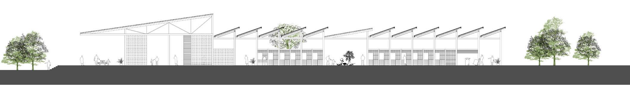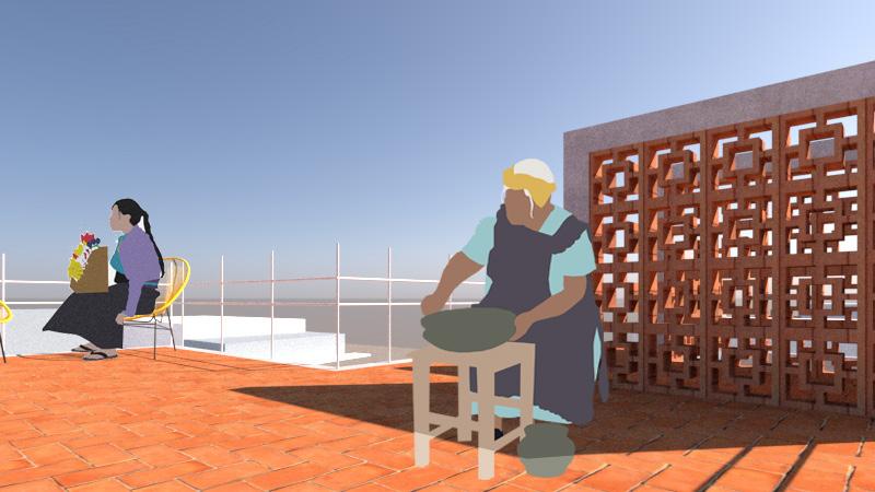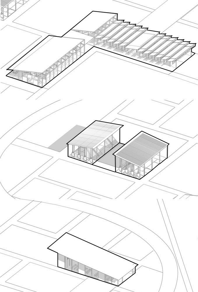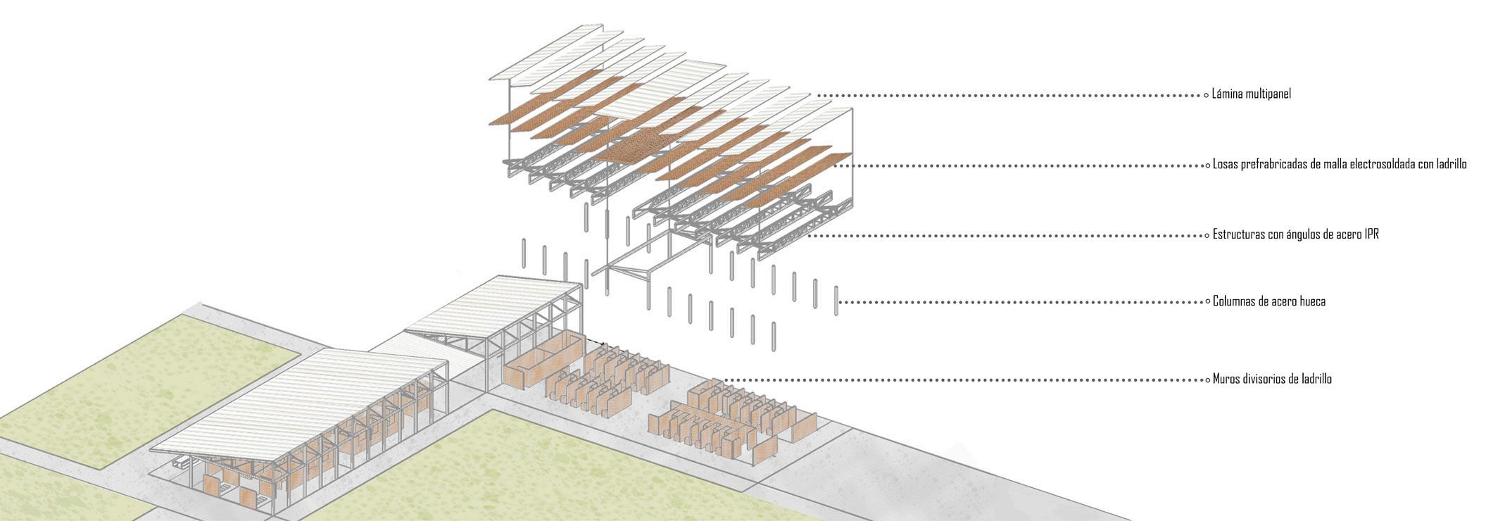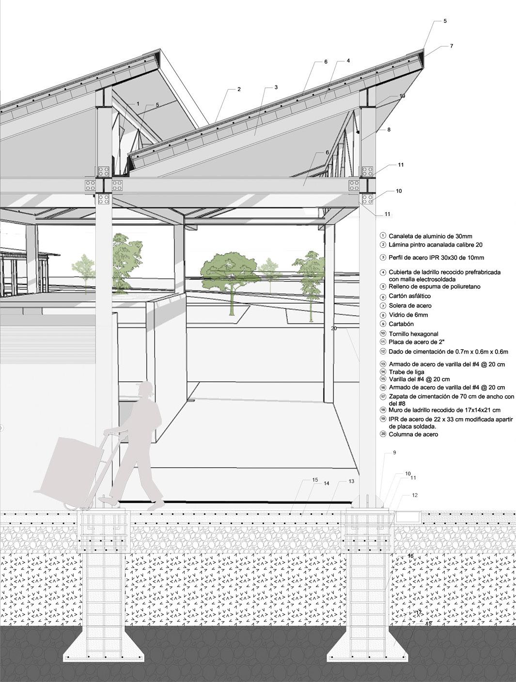 El edificio principal que está conformado por un mercado con una zona de puestos de comida y otra con productos hortofrutícolas, este se encuentra abierto en su estructura para crear recorridos continuos mos trando la intención en materiales que sean ligeros y que van de acuerdo con el mismo uso de estos en las etapas del paracaidismo, materiales como columnas de acero, cubiertas de lámina y celosías de ladrillo recocido.