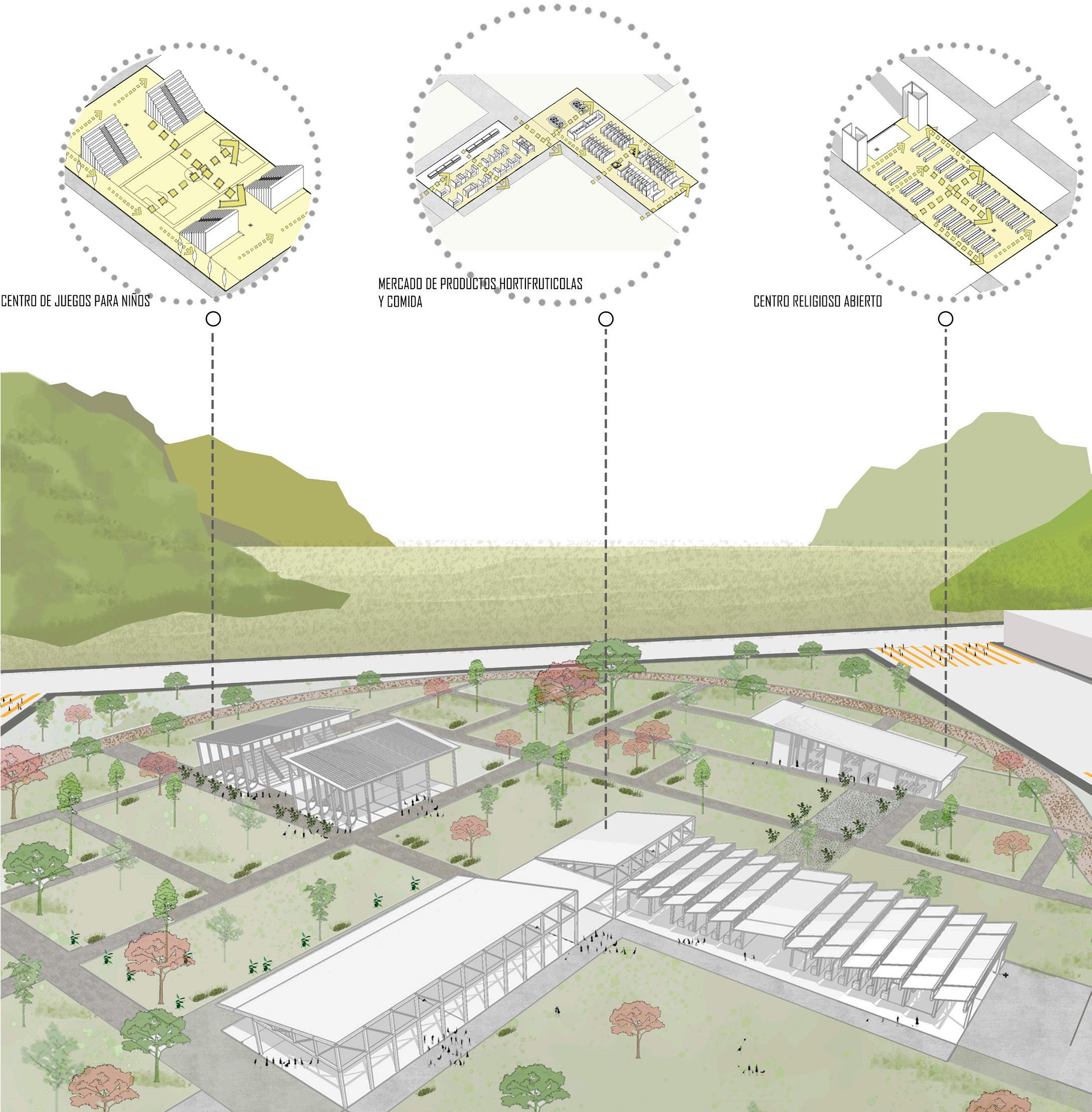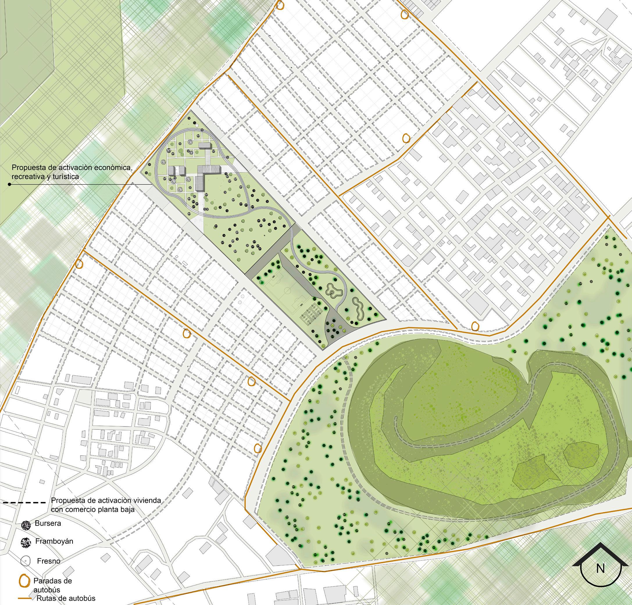 Se propone un conjunto de corredor verde que conecta en un extremo una montaña y otro con servicios que rematan en el corredor verde para crear una de modulación con base en supermanzanas y así darle una retribución económica a este tipo de barrios.