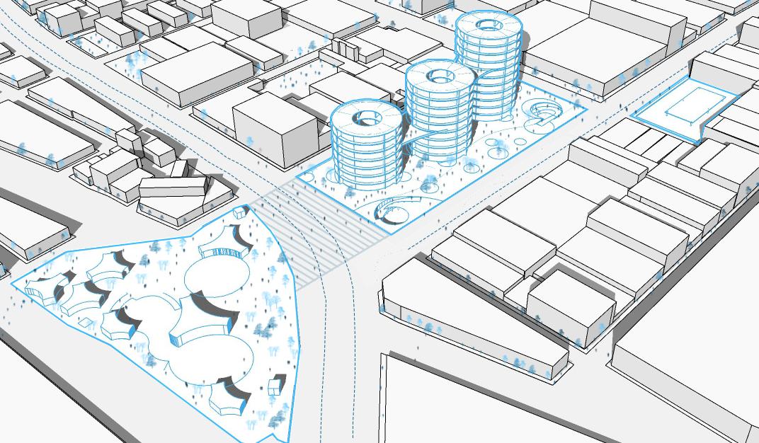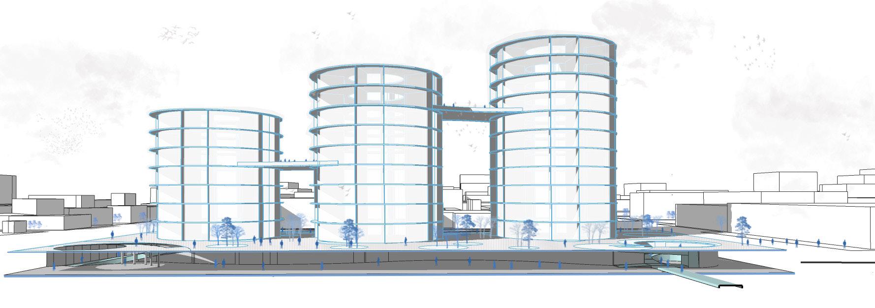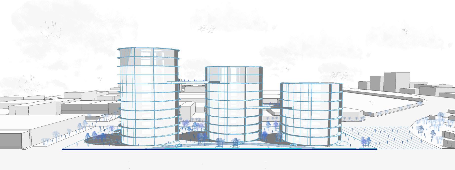 La propuesta cuenta con un remate en plaza verde conformado de 3 edificios que trabajan de manera si multánea.