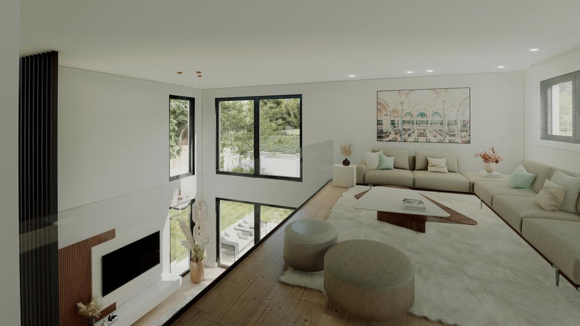 Lo que caracteriza a esta vivienda es el salón a doble altura, con ventanales a lo largo de los dos pisos. Es lo primero que se ve cuando entramos en la casa, lo que aporta sensación de amplitud y mucha luz a lo largo del día. La vida se desarrolla en la planta baja. Cuenta con tres dormitorios, sala de juegos, cocina conectada con el comedor y el salón y tres baños. En la primera planta se encuentra una zona de estudio y estar con un balcón que vuelca al salón.
