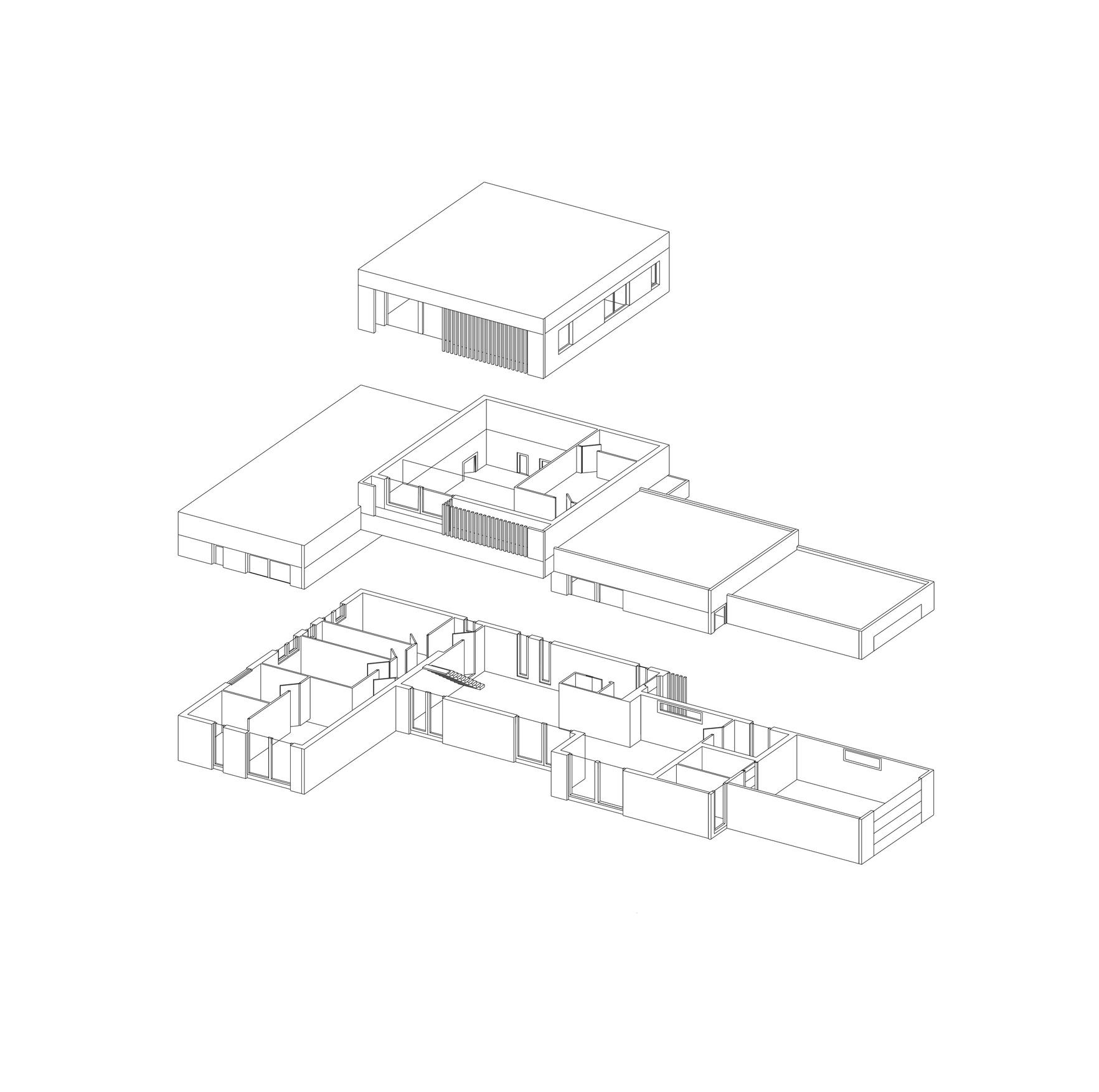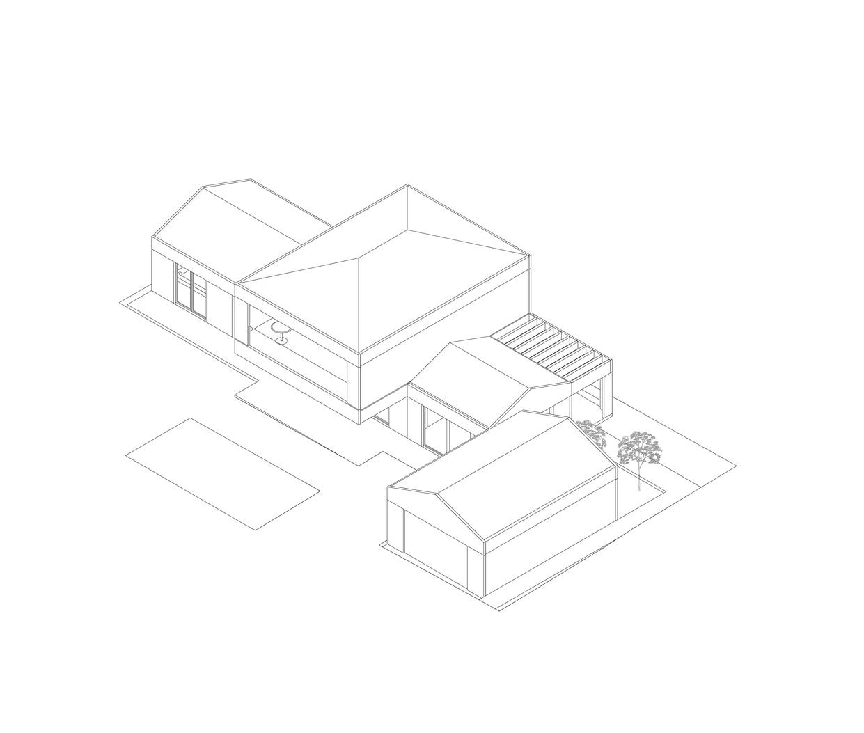 La volumetría se plantea en forma de L, abriéndose al jardín y cerrándose a la trasera de la casa. Se desarrolla en una sola planta, lo que permite generar espacios de continuidad y dividir las zonas de día y de noche en cada una de las dos partes de la L.