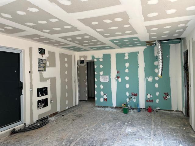 Una vez dispuestas las instalaciones se reviste el muro interior con un acabado Los revestimientos verticales se resuelven con pintura plástica lisa sobre los paramentos de placa de yeso debidamente tratados en todas las estancias, en los locales húmedos se dispone un alicatado cerámico. Los acabados se escogen siguiendo criterios de confort y durabilidad. En este momento también se colocan los pavimentos.