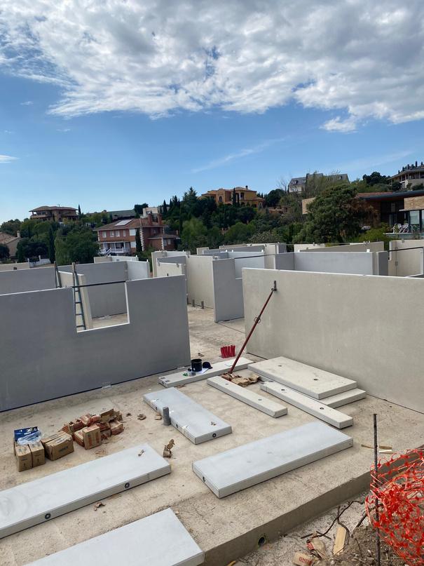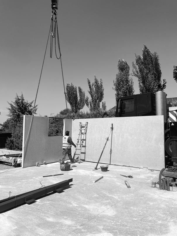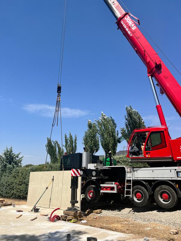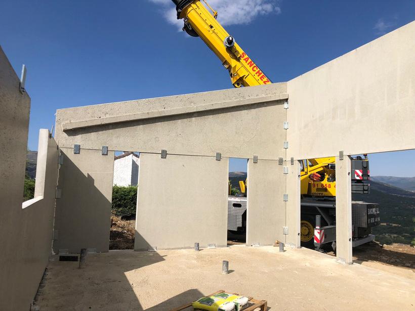 Colocamos los paneles verticales prefabricados que constituyen las paredes de la vivienda Los disponemos con la ayuda de grúas y los unimos al suelo y entre ellos con anclajes de aluminio, para posteriormente montar los horizontales, que corresponden a las cubiertas