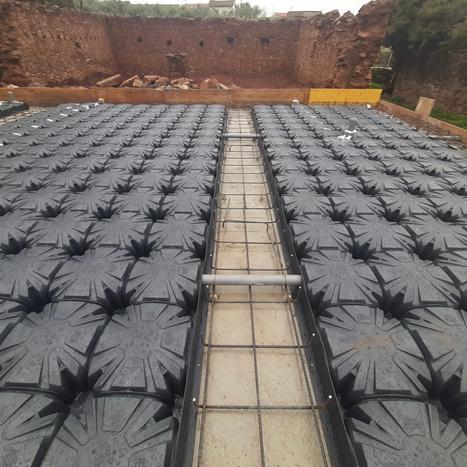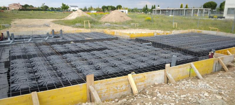 Realizamos una inspección del terreno para hallar el firme y sus propiedades. Cimentamos y colocamos un forjado tipo Caviti y el armado, para posteriormente formar la solera con hormigón vertido