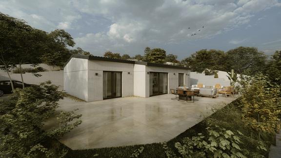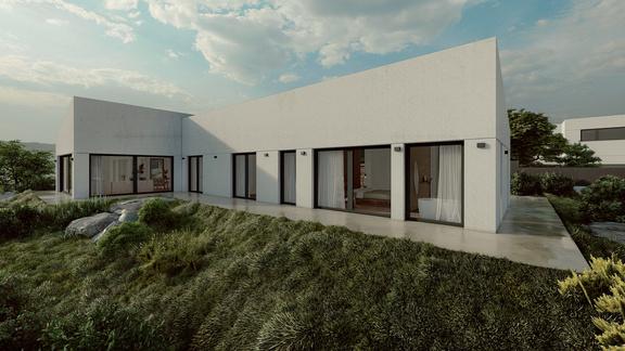 Proyecto de vivienda unifamiliar que se desarrolla en una sola planta. Este terreno tiene la peculiaridad de estar en cuesta. Para ello, realizamos el desmonte del talud y generamos una superficie plana dónde cimentar la vivienda y excavar la piscina. Cuenta con un voladizo que crea un espacio de sombra y protege las estancias de la luz directa del Sol