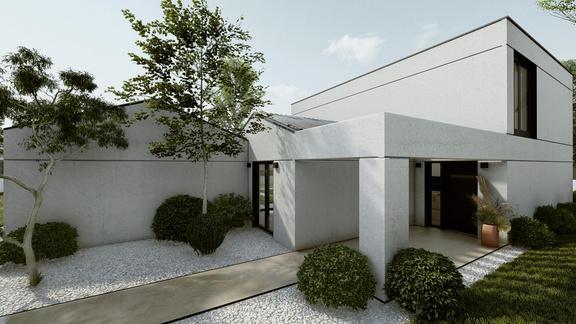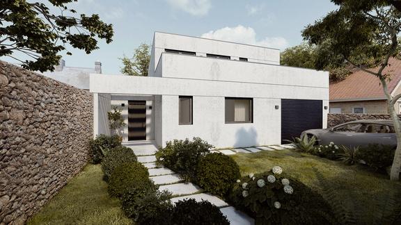 Proyecto de vivienda unifamiliar que se desarrolla en dos plantas. El acceso se efectúa por el jardín trasero que cuenta con entrada para vehículos y garaje. La entrada principal está protegida con una pérgola de piezas prefabricadas que enmarca la zona de la puerta y generan sombra.