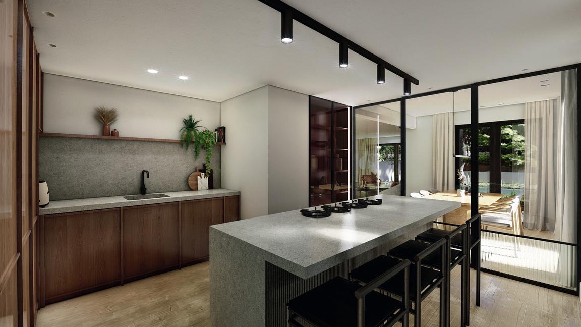 Cuenta con una cocina abierta pero que está separada por una puerta corredera de cristal. Se genera continuidad y amplitud entre los espacios, pero a su vez no tiene los inconvenientes de una cocina unida al salón-comedor.