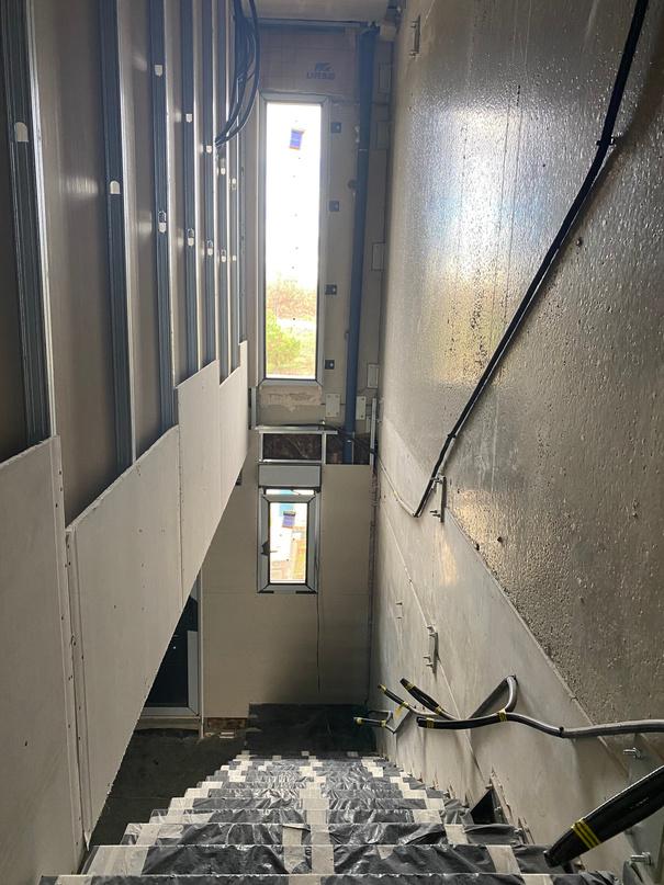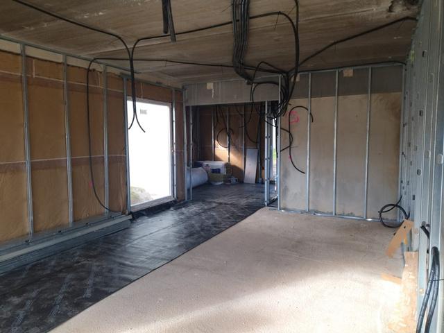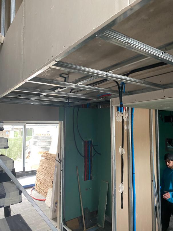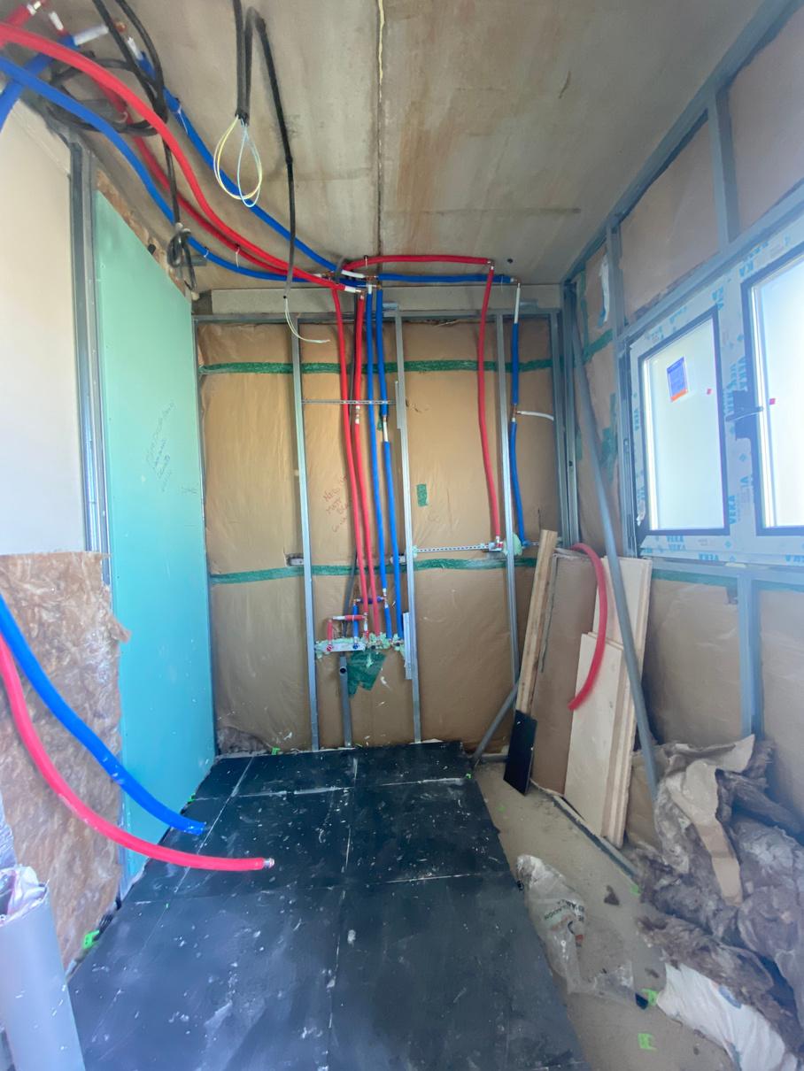Las viviendas cuentan con sistema de ventilación, un sistema climatización mediante suelo radiante, fontanería, evacuación de aguas, telecomunicaciones...Todos los conductos y cableado se lleva por las paredes, techo y suelo. Se disponen una vez esté listo el trasdosado y se cubren con los acabados interiores para que no queden vistas.