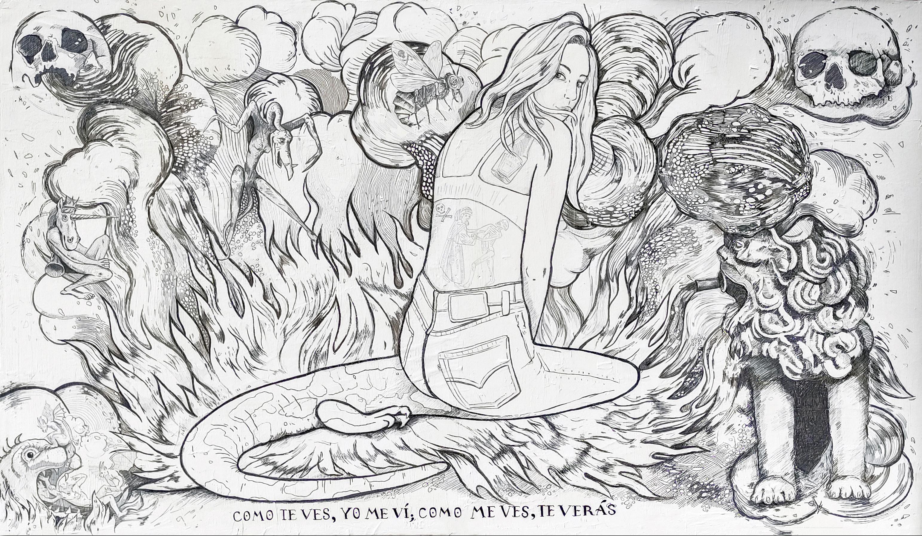 Iconos Contemporáneos principal, una mujer salamandra, es en sí misma un desafío: un personaje de morfología compleja que se comunica de manera directa con el espectador mediante la mirada y el texto «Como te ves, yo me vi; como me ves, te verás». El blanco y negro funciona como aliciente en este horror silencioso. Los trazos dicen lo que tienen que decir en cada uno de los niveles en los que se proponen hablar. La arquitecta, de nuevo, ha domado lo real y lo abstracto para traerlos al mismo plano y ponerlos a disposición de su narrativa.