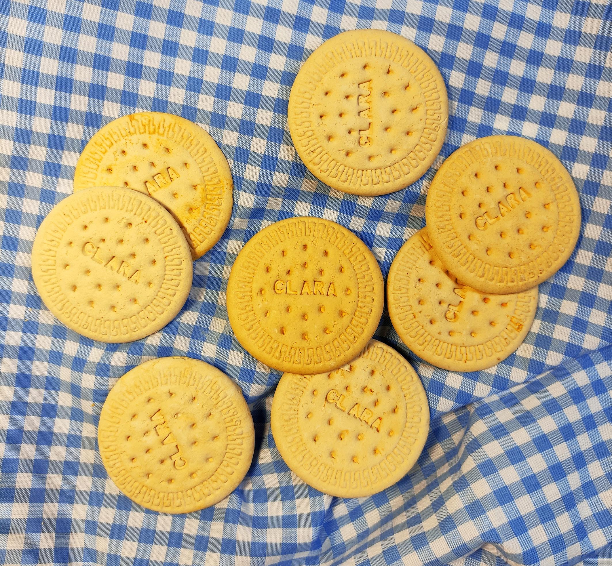 La propuesta de Clara Gómez Campos también genera una ruptura artística que abre otra puerta en su obra. Con todas las apuestas que ello implica, se considera artista plástica además de pintora. Como en los cuentos Las babas del diablo y Continuidad de los parques de Julio Cortázar, la ficción sale a buscar al lector –espectador, en nuestro caso– en su propio mundo. Ya no tenemos solo el reflejo de una realidad o un icono, como en el retrato monocromático del político Julio Anguita, sino que encontramos elementos que quieren entrar en los cuadros, como los soldados de Avant–garde land, y una realidad que quiere salir de la pintura. Un ejemplo de este último juego son las galletas marca Clara que la artista incluye en la exposición Iconos contemporáneos: un artículo que nació en sus dibujos y que el visitante encontrará de forma física, invadiendo su propio plano existencial igual que los humanos son invadidos en Un dinosaurio en mitad del campo.
