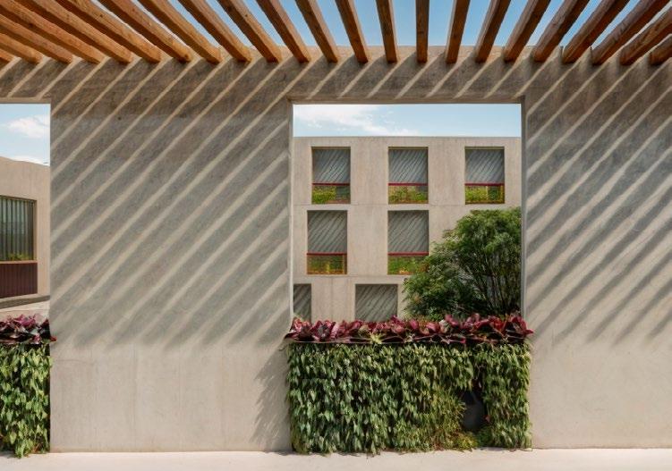 To mitigate heat from the afternoon sun, wooden latticework has been incorporated to provide effective shading, while brick has been used for its thermal insulation properties, enhancing the home’s overall energy efficiency and comfort.
