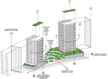 Bioclimatic strategies include plant-adorned balconies for natural cooling and shaded green areas, promoting energy efficiency and harmony with nature. Distrito Vivo merges modern living with ecological and social responsibility.