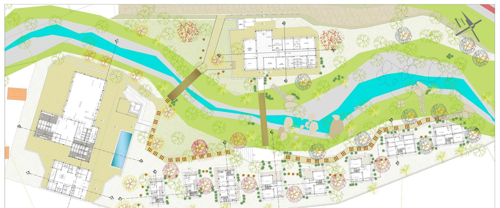 Así mismo se llego a la conclusión y desarrollo de un complejo ecoturístico emplazado en dichas áreas verdes, aprovechando y potencializando el entorno paisajístico para que envuelvan a los diferentes módulos que a su vez se abren hacia el exterior.
