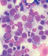 MDS mit Übergang in eine akute myeloische Leukämie (AML) mit Blasten (grosse Zellen mit grossen Kernen mit Nukleolen und schmalem basophilem Zytoplasma)