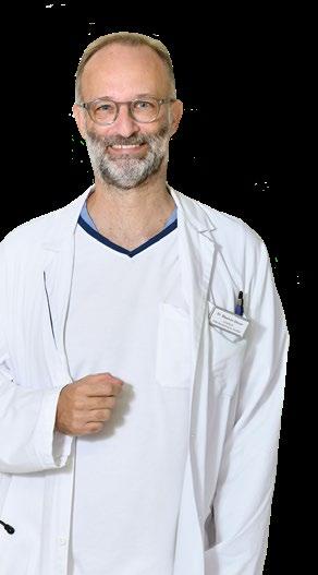 Bei der interventionellen Radiologie han delt es sich um therapeutische Eingriffe mithilfe radiologischer Techniken. Eine Spezialisierung des Claraspitals ist die Ablation, mit der es gelingt, Tumore auf schonende Weise gezielt zu zerstören. «Dafür bringen wir Nadeln in den Tumorherd ein. Vorne an der Nadel befin det sich ein Mikrowellensender, mit dem man die Tumorzellen zerstören kann», erklärt Prof. Martin Hoffmann. Eine weitere, modernste Krebsbehand lung kommt zum Zug, wenn die ganze rechte Leberhälfte von Krebs befallen ist. «In diesem Fall verschliessen wir mit einer Intervention die Leber vene und die Pfortader und hängen so den Tumor von der Blutversorgung ab. Anschliessend war ten wir zwei bis vier Wochen, bis die gesunde linke Leberhälfte auf das Doppelte angewachsen ist, sodass die Chirurgen den rechten Teil heraus operieren können.»