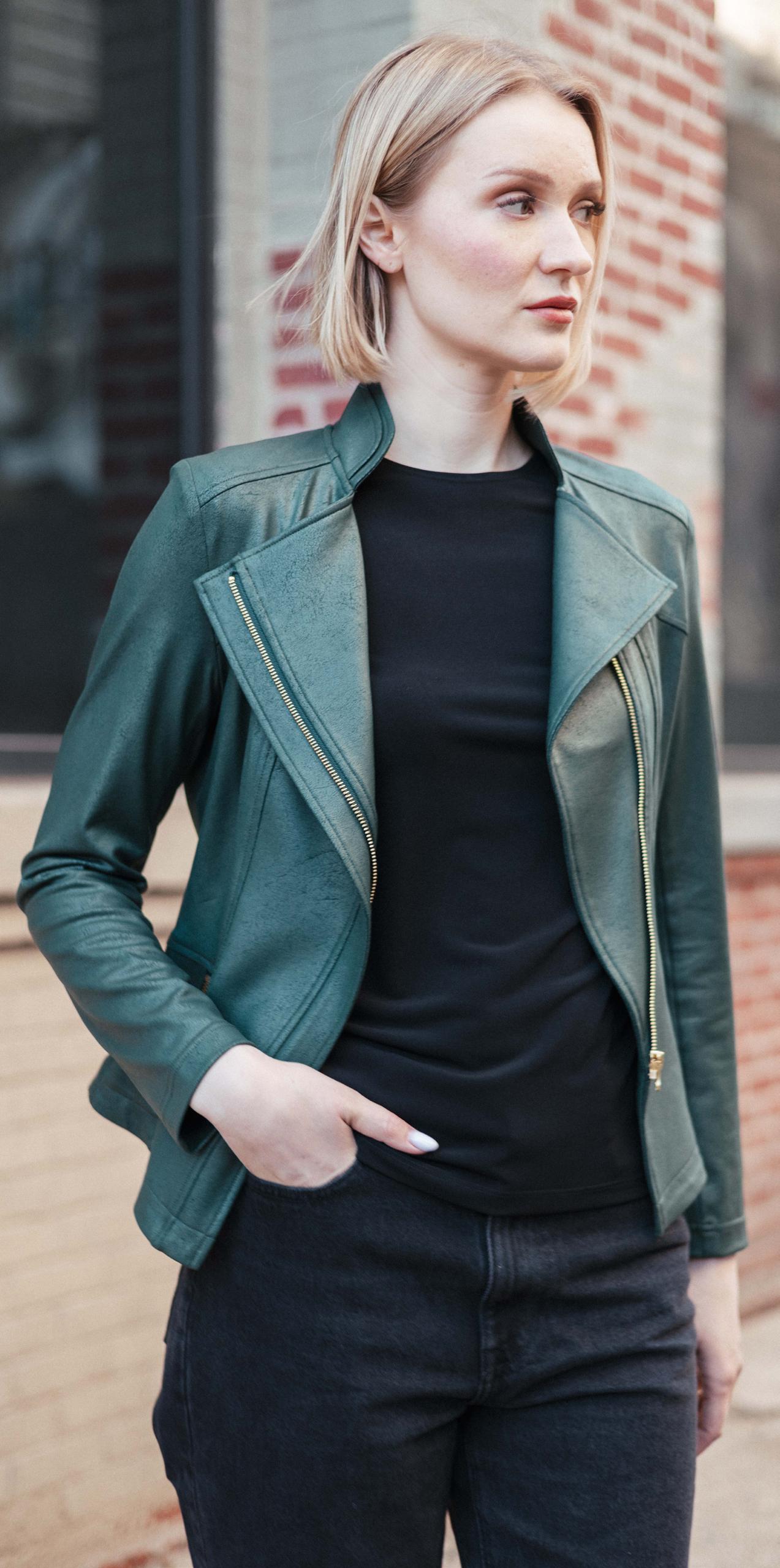 One of Oprah’s Favorite Things! Liquid leather is not pleather or leather. An exciting innovative knit fabric created by Clara Sunwoo, liquid leather is luxuriously soft, stretchable, breathable, vegan friendly and fits like a glove.Unlike other leather jackets, you can easily pack and roll-up. Meet the new modern cardigan!