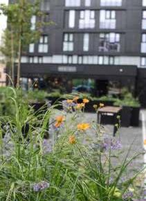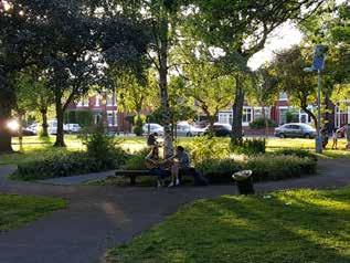 Low traffic neighbourhoods in dense terraced housing. Limited on street car parking. Street trees and pocket parks. Use of re-purposed car parks.