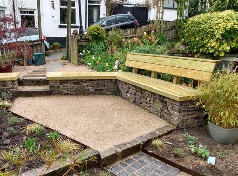 A eco friendly small garden on a tight budget. Self binding gravel and a built in bench made from gabion baskets. Two alternative seating areas make the most of the sun at different times of the day.