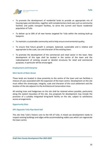 Employment and Enterprise MU1 North of Main Street These lands are located in close proximity to the centre of the town and can facilitate a mixture of uses associated with the expansion of the town centre. Development on the site must reflect the streetscape, integrity, scale and character of the rural settlement and the location of the site adjacent to the Architectural Conservation Area. All existing trees and hedgerows on the site shall be retained where possible, particularly along the eastern boundary of the site. Any proposals for development may include the provision of a suitably integrated bring-bank facility on the site, subject to satisfactory access arrangements. Opportunity Sites OP1 Opposite Tulla Pipe Band Hall This site links Tulla’s historic core to the Hill of Tulla. A mixed use development needs to respect existing buildings and edges while accommodating viable uses which can regenerate the town centre.