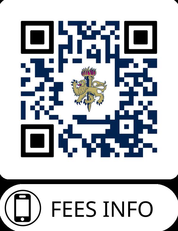 Full details, including lunches, school bus, wraparound care, and cocurricular activities, can be downloaded via the QR code. 15 hours government funding for ages 3–5; childcare vouchers accepted; sibling discounts from 10%. For further queries, contact our Business Services Office on 01372 473602.