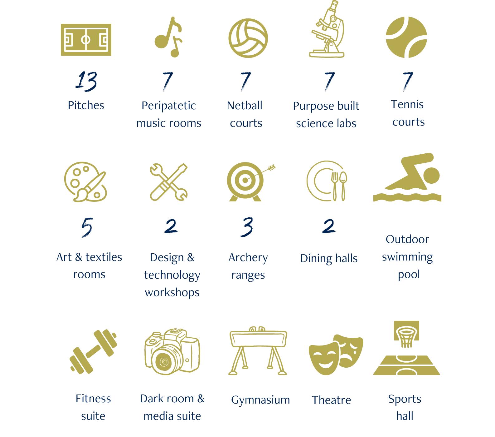 WITH SUCH EXTENSIVE GROUNDS THERE ARE FOOTBALL, RUGBY AND LACROSSE PITCHES GALORE, PLUS TENNIS COURTS, NETBALL COURTS, CRICKET FIELD, ATHLETICS FACILITIES, SWIMMING POOL AND A SPORTS HALL AND GYM.