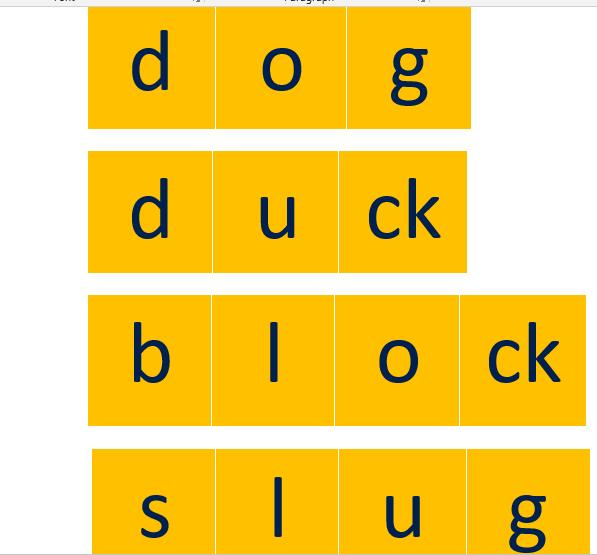 They will use these phonemes to read and spell simple “consonant-vowelconsonant” (CVC) words: sat, tap, dig, duck, rug, puff, hill, hiss