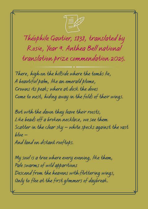 There were over 5000 entries to the competition from schools acr selected by the judges for a prize, and Rosie in Year 9 was one of t translation from French of the poem ‘Les Colombes’ by Théophile (Y10) and Jinny Patel (Y10) for their excellent entries, and to Steph their commendable contributions.