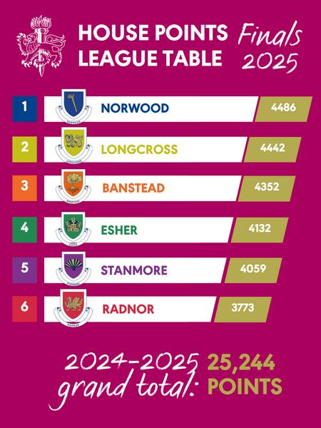 CongratulationstoNorwood,whohavetriumphedasthisyear’s househupwinners!Norwoodpupilshaveearnedeverypointwith passionandpride.CongratulationsalsotoLongcrosswhocamein second,andBansteadinthird