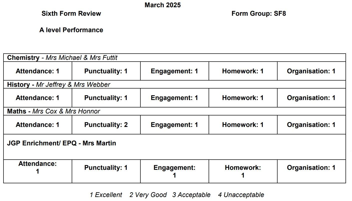 • Performance in subjects, attitude to learning, attendance, punctuality, meeting deadlines and dress-code.