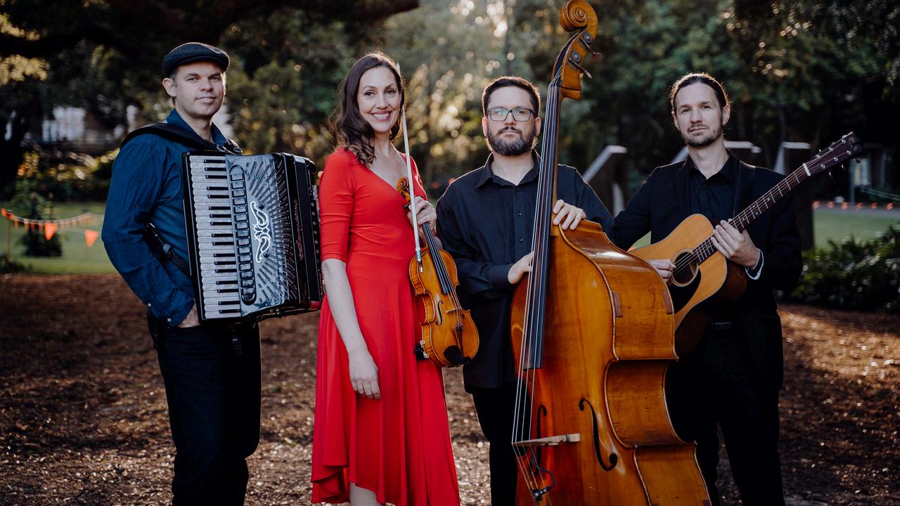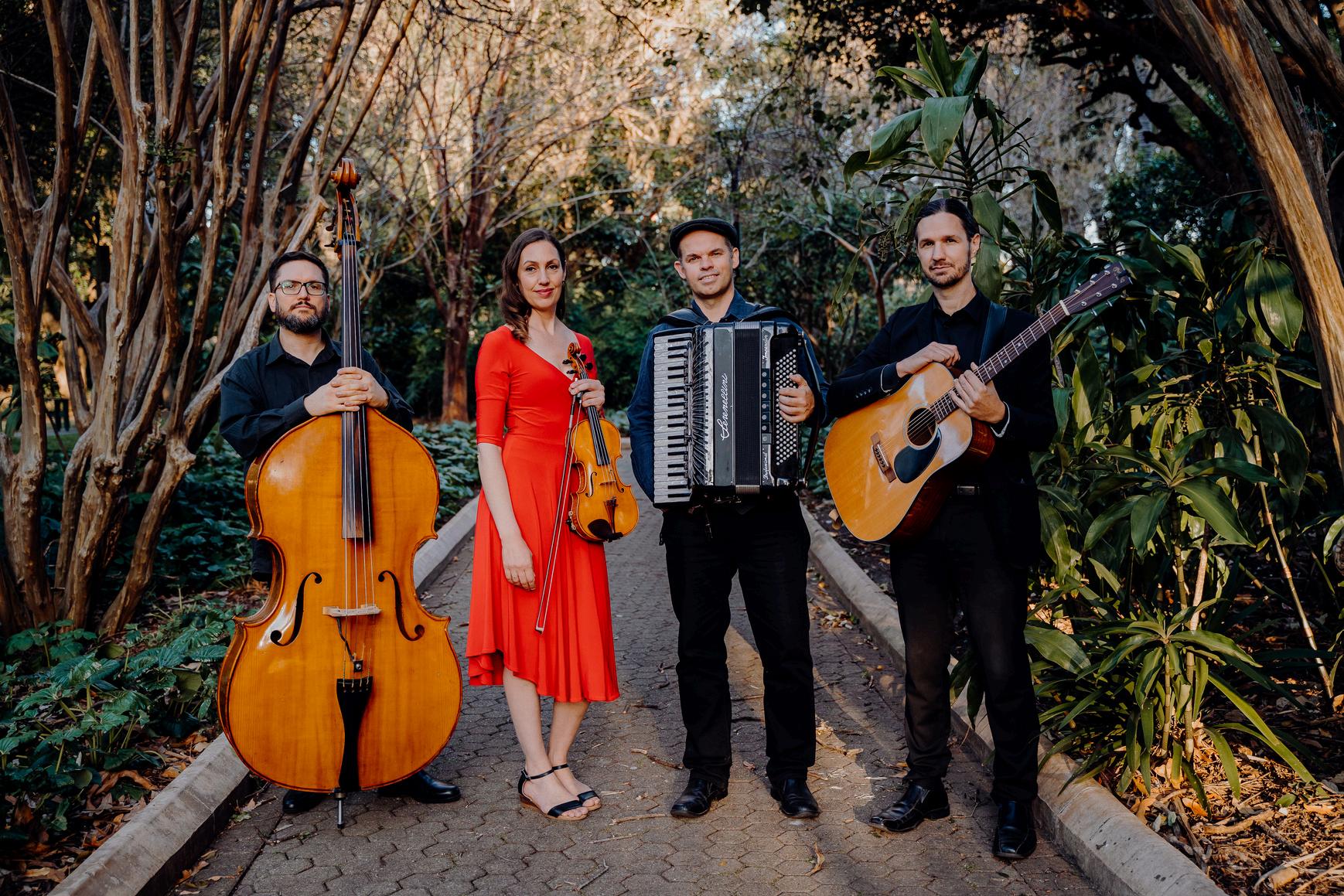 This concert presents an eclectic mix of music from various cultures and genres. The band takes the audience on a musical journey, beginning with a lively Swedish contemporary folk cover of Vasen, followed by a sultry French gypsy bossa