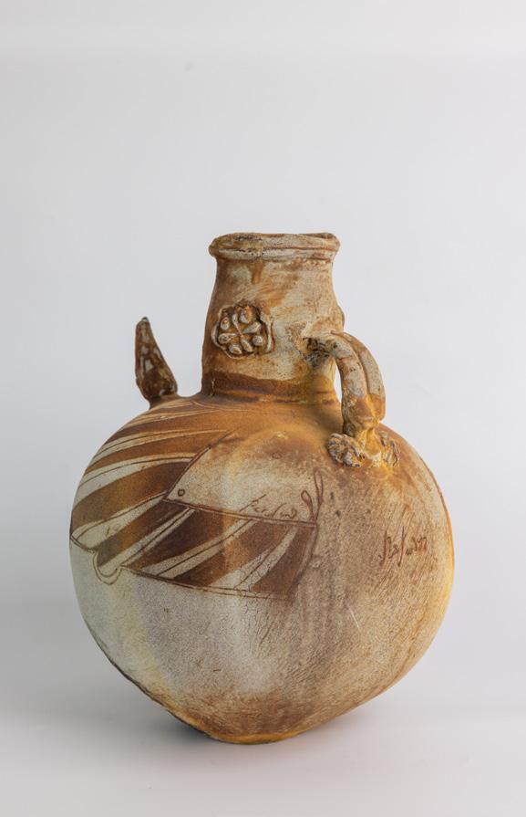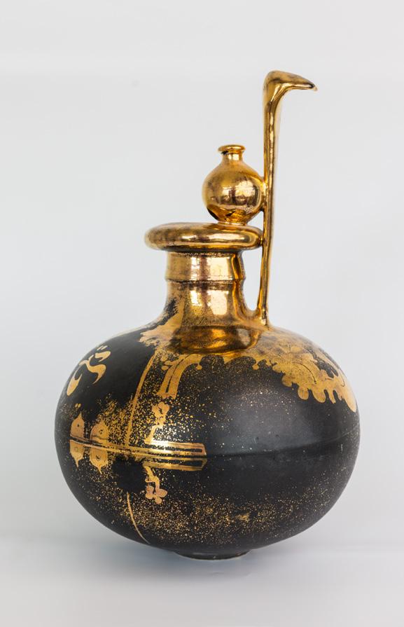 Alan’s practice was shaped as much by his deep research into historical ceramic traditions as by personal innovation. He travelled widely and studied deeply, especially in the Middle East and later Italy. In Egypt and Iran, he was captivated by ancient ceramic techniques, Islamic architecture, and Sufi mysticism. In Gubbio, Italy—where Islamic lustre traditions met Renaissance invention—he found a kindred spirit in the late master potter Giampietro Rampini. Alan taught Giampietro reduced lustre while Giampietro taught Alan majolica. His work was a synthesis of the ancient and the modern: Persian calligraphy dancing across twentieth-century forms; Fatimidinspired patterning rendered in his own distinctive hand.
