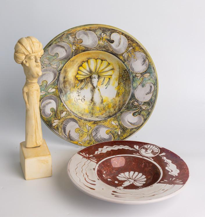 Group of works belonging to Mad Hatter series 2002, lustre bowl, majolica bowl and porcelain figure