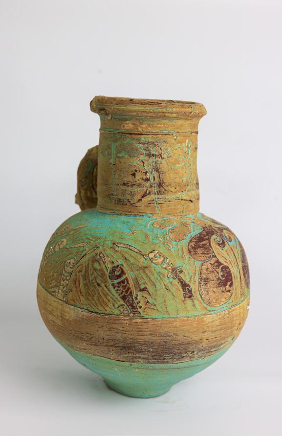 Fish Talk pot 1990s, dry glaze with sgrafitto, 32 x 24 cm