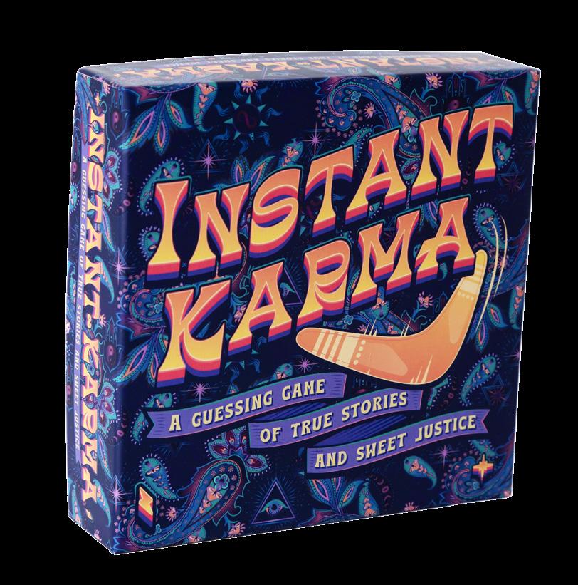 Aim of the game: Instant Karma is a party game that celebrates when the Universe, in the most fitting ways imaginable, has punished jerks for screwing over or being shady to others. In this game, which contains 300 hilarious real-life stories of poetic justice, players try to bluff each other by trying to think up just desserts that are more plausible than what really happened!