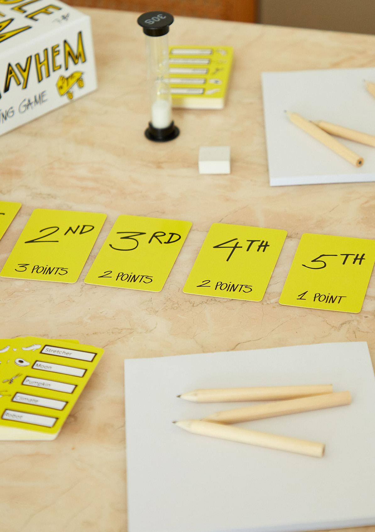 In this chaotic party game, everyone grabs a pen, a number card, and a word card packed with four random words. The twist? You can only use the numbers in front of you to create clues—and fast. Scribble out your numbers or parts of your numbers to create letters and hint at the word you picked. Can your team crack the code before the timer runs out? No drawing skills required. Just wild ideas, quick thinking, and a bit of Blotto brilliance