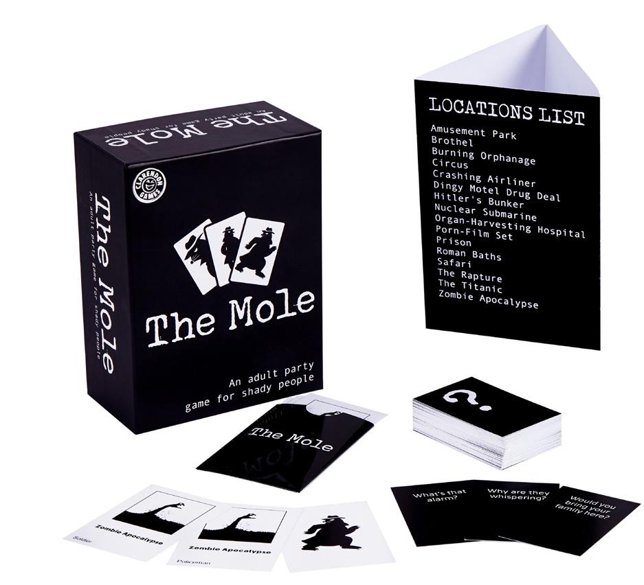 The Mole is a hilarious, naughty, conversation-based game in which players use observation, bluff and cunning to win. The spies only have a few minutes to identify the mole in one of 16 secret, adult-only locations – from a porn film set to an organ harvesting hospital - while the mole is only ever one incriminating answer away from blowing their cover. Can the mole guess the secret location and foil the plot? Or will the spies unmask the mole in time?