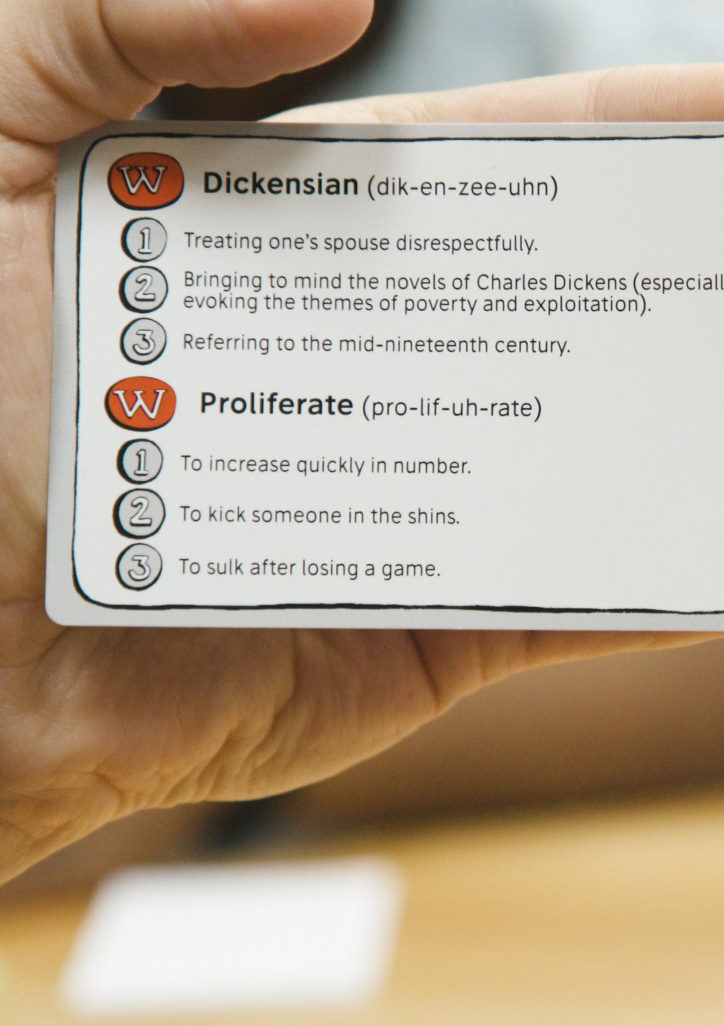 Aim of the game: Wordsmithery is dead easy. Guess the meaning of a word. All 700 of our words are exactly the kind of words that you pretend to understand… when you don’t. Words like egregious, phalanx and salubrious. Don’t worry. You get three possible – and fun – definitions to choose from. First to ten points wins.